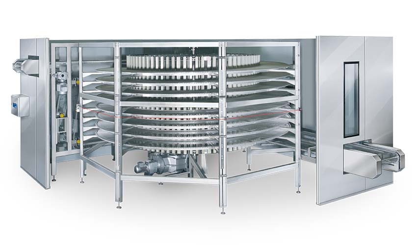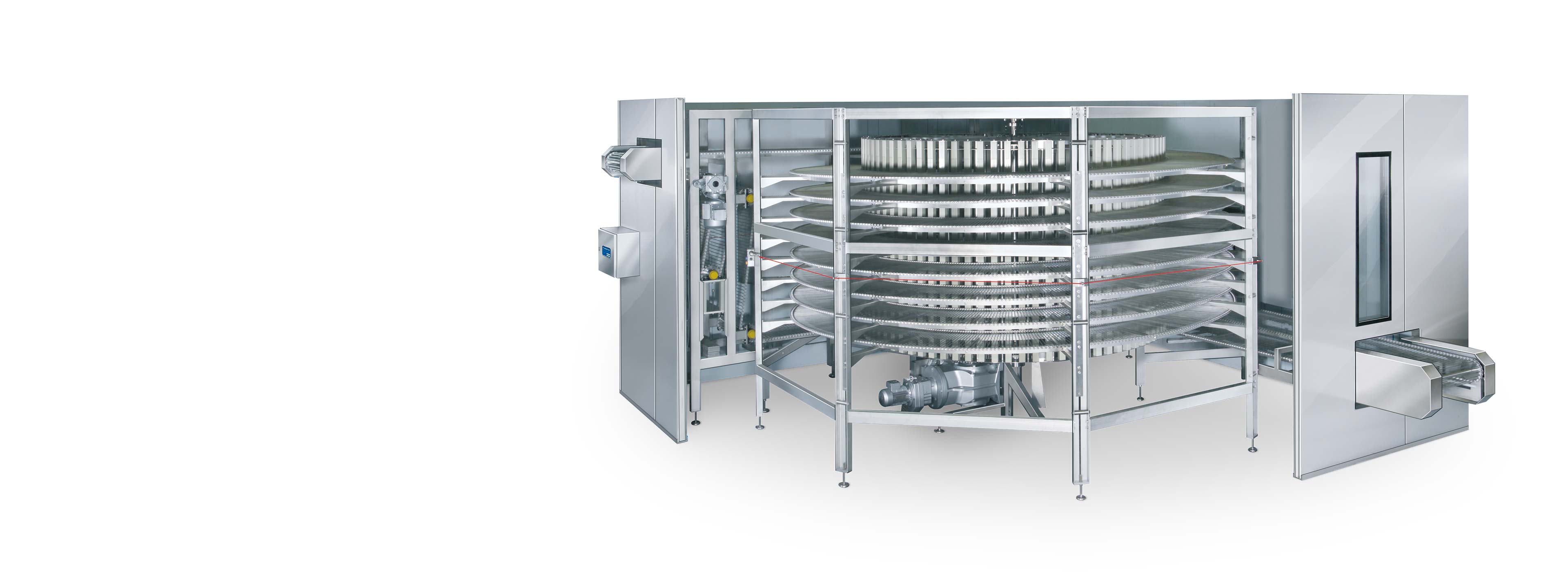 Spiral coolers have a spiral-shaped cooling section and are used preferably where wafer sandwiches are not allowed to be turned during the cooling operation (e.g. sandwiches with strewed topping).