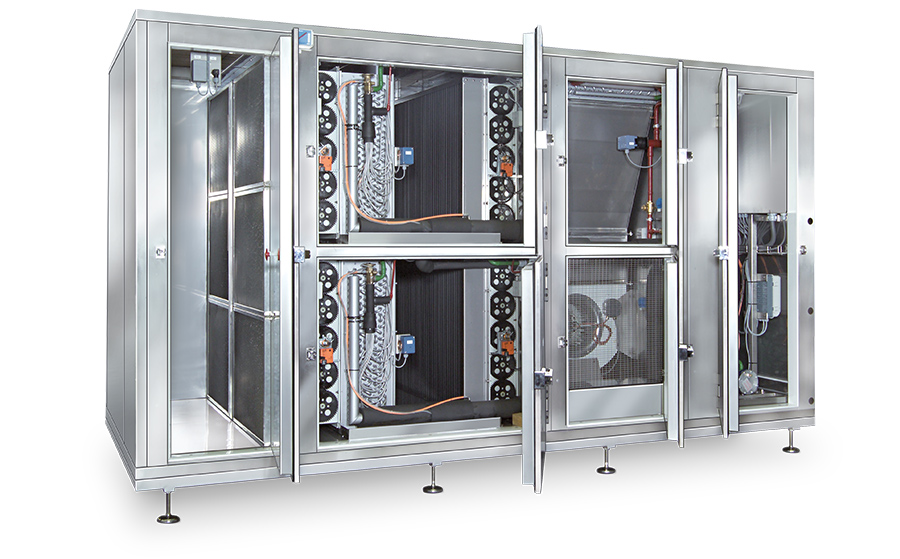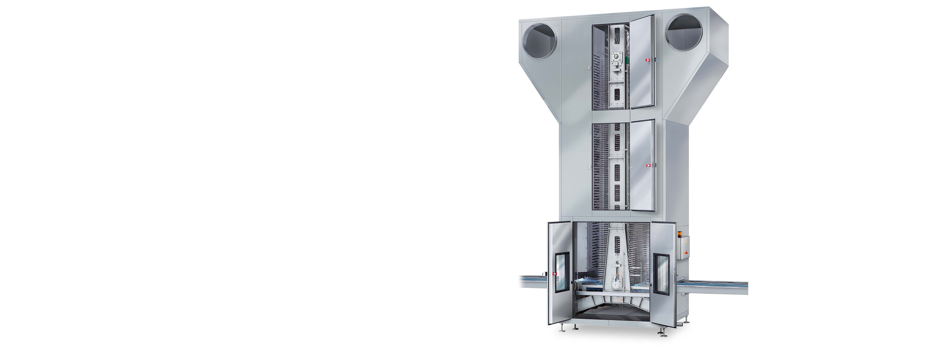 Coolers of the KT type generally operate with circulating air, i.e. the cooling air heated by the wafer sandwiches is continuously sucked off from the cooling zone, cleaned and cooled in the evaporator. The cooling time is set between 5 and 20 minutes depending on the product.